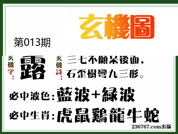 | 013期: ⑨肖 | 猴羊猪鸡牛蛇虎龙狗 | ????中 |