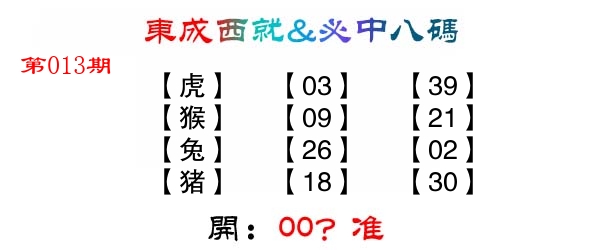 | 013期: ⑧肖 | 猴羊猪鸡牛蛇虎龙 | ????中 |