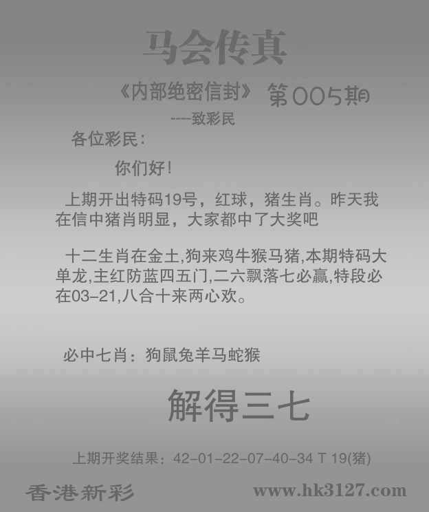 | 005期: ⑥肖 | 猴虎牛鼠鸡蛇 | 狗44中 |