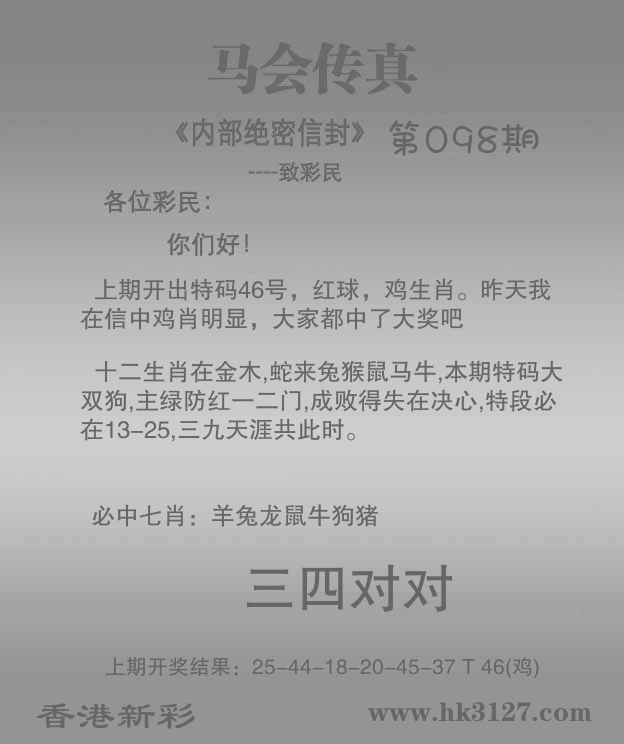 | 098期 | 马 | 3尾 | 红单 | 38-47 | 29虎 |